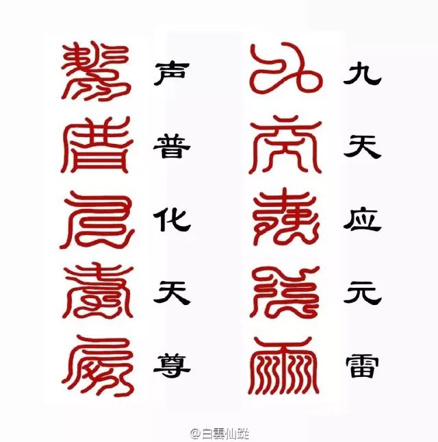 九天应元府,无上玉清王。化形而满十方,谈道而趺九凤。三十六天之上,阅宝笈、考琼书。千五百劫之先,位正真,权大化。手举金光如意,宣说玉枢宝经。不顺化作微尘,发号疾如风火。以清静心而宏大愿,以智慧力而伏诸魔。总司五雷,运心三界。群生父,万灵师。大圣大慈,至皇至道。九天应元,雷声普化天尊。